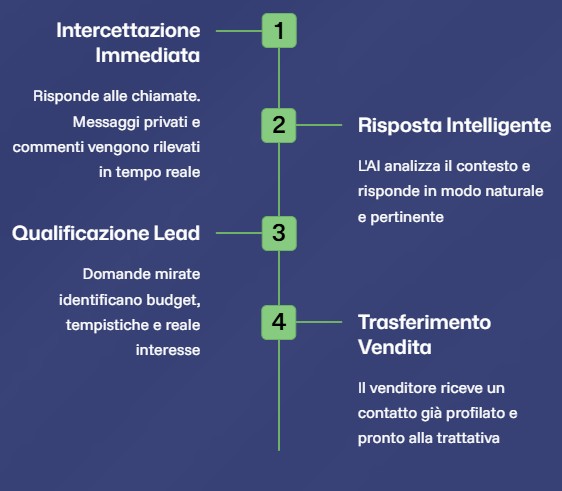 Ogni like, ogni commento, ogni condivisione può diventare un cliente reale. Il sistema cattura queste micro-interazioni e le trasforma in conversazioni di vendita qualificate.